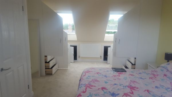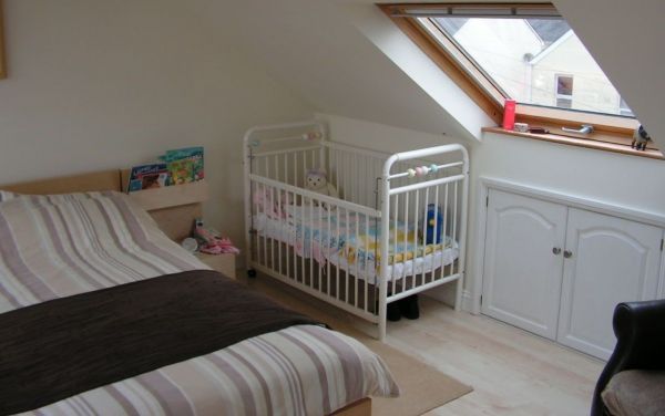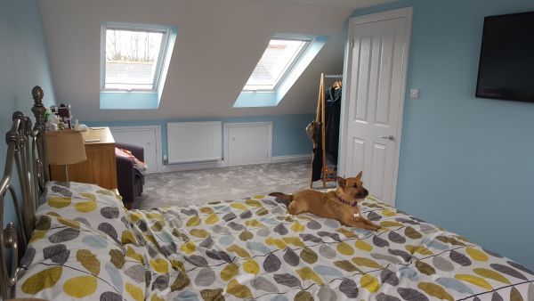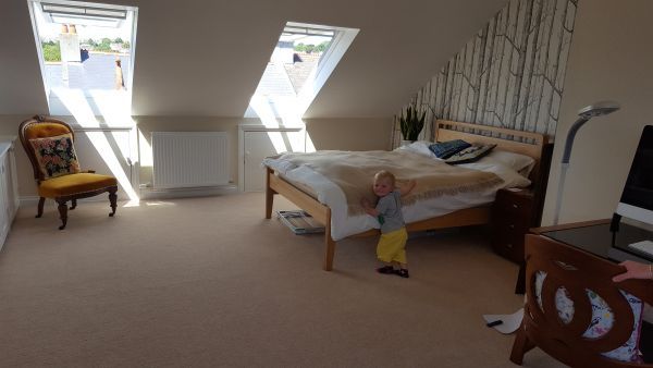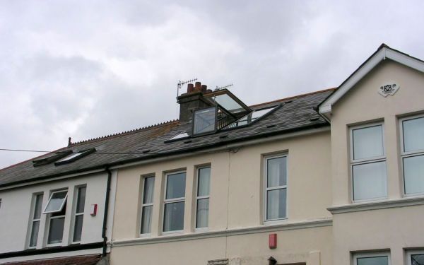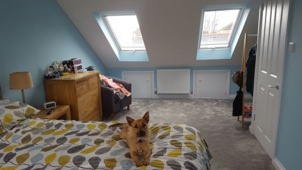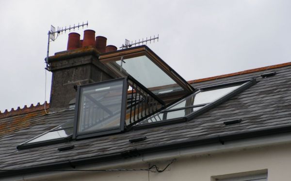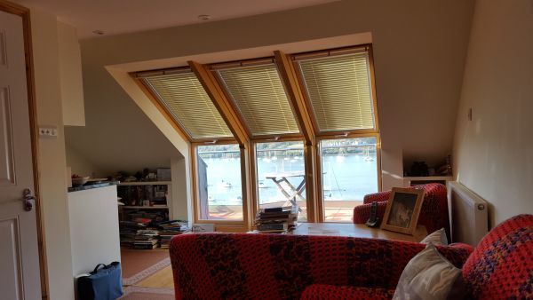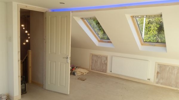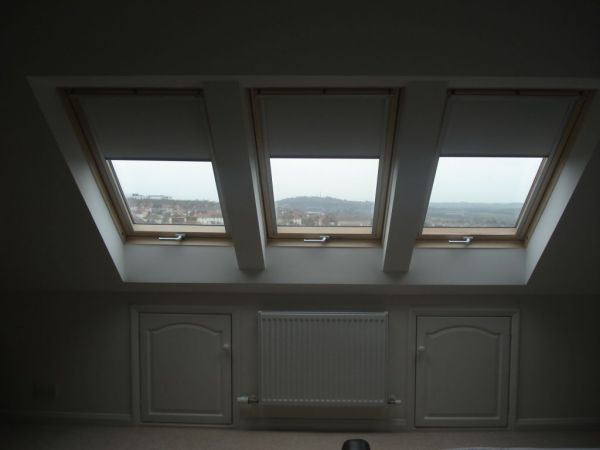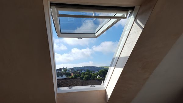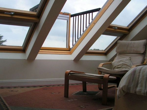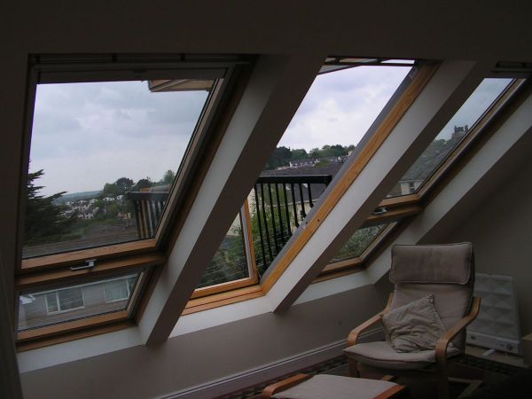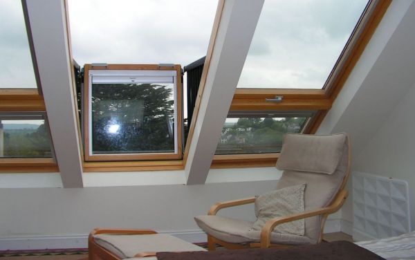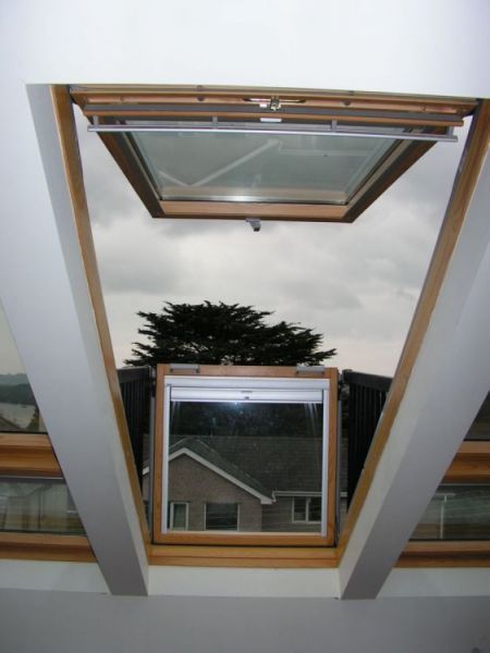 As standard we fit two white or pine top hung Velux to the front roof slope and over the new stairs we fit a small center pivot Velux to give natural light to the stairwell.